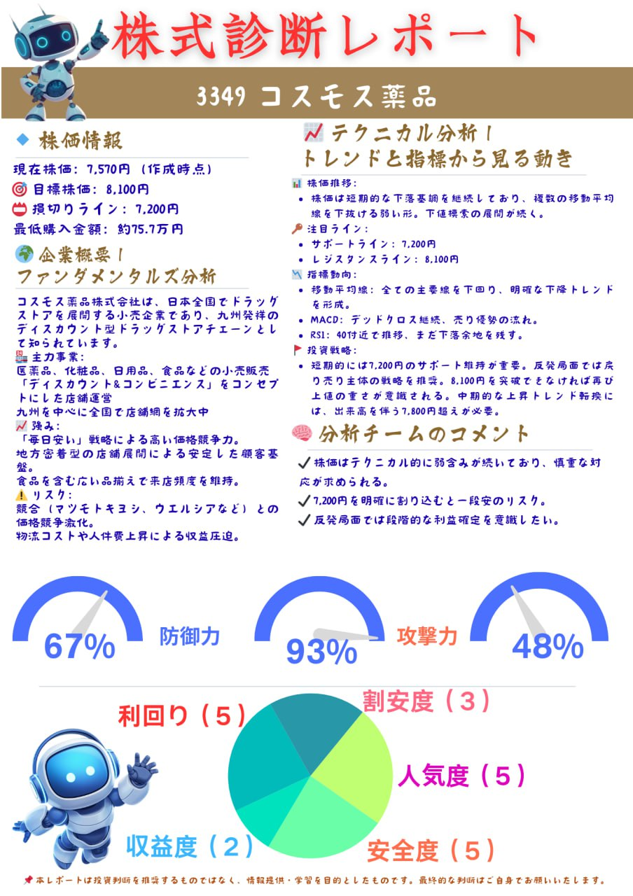 AIが多面的な公開情報を基に銘柄の健全性を構造的に評価し、値動きや業界内での位置づけを把握するのに役立ちます。
